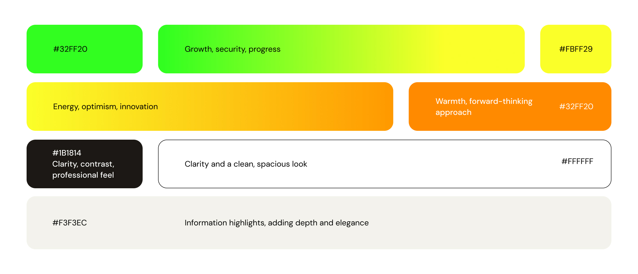 The color palette plays a crucial role in reinforcing trust and dynamism.
