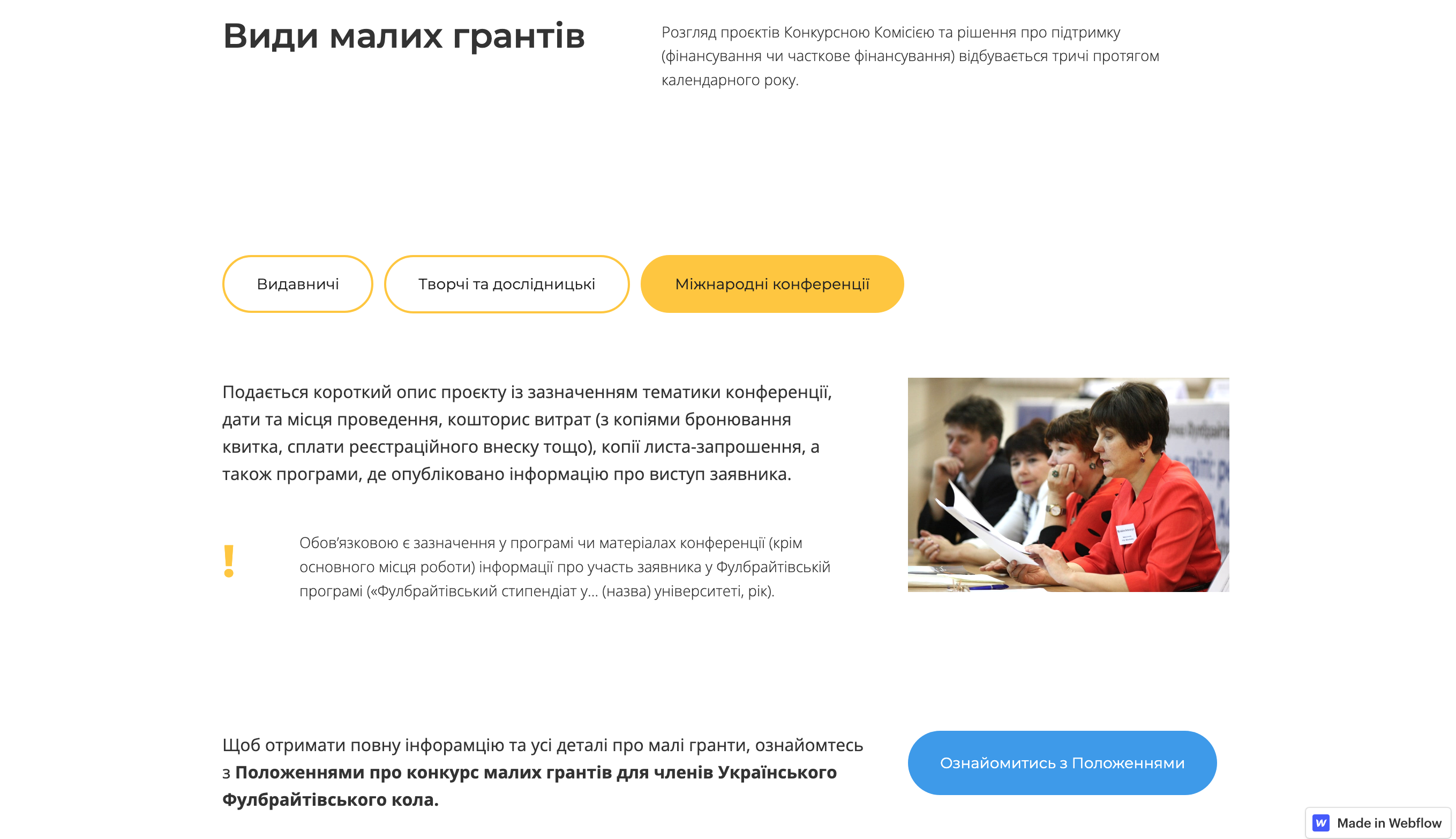 The Ukrainian Fulbright Circle is an organization that unites graduates of the Fulbright Academic Exchange Program in Ukraine, as well as other international programs. Today, the Ukrainian Fulbright Circle has more than 350 active members, including scientists, teachers, cultural and artistic figures, university administrators, and public activists. In Small Grants competition, the organization annually selects up to 20 projects (research, creative, publishing, support for participation in international scientific conferences) of graduates of the Program.